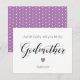 Ask that special woman in your life to be your child's godmother with this personalised godmother proposal card. This design features a little purple heart and white polka dots on purple on the back.Customise this cute card with her name and your child’s name.