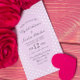 Purple invitation with white hearts for a Valentine's day or year round romantic wedding