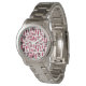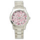 This women's watch has a repeating pattern of ovals in retro purple with scattered white ovals all on a field of white.