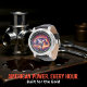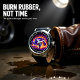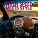 This bold watch face features a vintage-style purple hot rod car, its lower half engulfed in vibrant orange and yellow flames, appearing to speed across a dark, reflective road. The black background emphasises the intense motion and fiery elements of the car, creating a powerful and dramatic design for automotive enthusiasts.