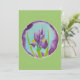 Iris lovers will enjoy this purple iris flower batik art. It is a batik of a purple iris with two green leaves on a colourful background of purple and blue.