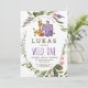 Invite friends and family to celebrate your baby's 1st birthday celebration with this sweet jungle safari animal birthday party invitation. This First Birthday Party Invitation features a tiger, monkey, elephant, and a giraffe surrounded by botanical leafing with pink and purple flowers with a purple background on the back of the invitation.