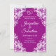 "An elegant and classic wedding invitation with vibrant purple background and delicate white lace border.
