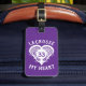 Cool heart made of the heads of lacrosse sticks professes your love for the sport. Customise with your player's number over the ball inside the basket. Makes a great personalised gift for a lacrosse player, coach, team, player mum or fan. Available in red, orange, green, purple, blue, maroon, powder blue, and black. Or change the background to match your team. Matching products available.