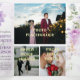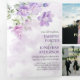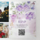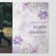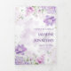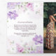 The trifold invitation features a soft, watercolor-style floral design. Clusters of delicate flowers in shades of purple, lavender, and pink bloom across the top and bottom, interwoven with pale green leaves and subtle branches. The layout creates a gentle, natural frame around the centre, drawing attention inward while keeping a light, elegant aesthetic throughout. The colour palette feels romantic and fresh—perfect for a spring or summer celebration.