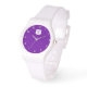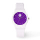 Purple monogram watch with custom initial. Customise the modern initial font letter in the shield icon to make it a unique present. Beautiful gift idea for women on Birthday, Mothers Day etc. Colourful design with personalizable background colour.