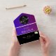 Simplistic, minimalist, modern, contemporary bold purple gold and black all-in-one wedding invitation with QR code, monogram with hand drawn love couple birds, trendy handwritten script and custom picture of the at the back.