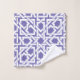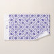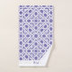 Moroccan style weave trellis geometric pattern in periwinkle purple and white. The hand and bath towels have a single white stripe where a monogram or name in matching font can be personalized.