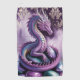 A fantasy digital art piece of a majestic purple and blue dragon curled around a stack of glowing purple and turquoise stones. The dragon has iridescent scales with a gradient from deep purple to bright blue, detailed with intricate patterns and spikes along its back. Its body is coiled in a graceful S-shape, resting on and wrapping around several large, smooth stones of varying sizes. The stones emit a soft purple glow and are partially submerged in a reflective purple-tinted water at the bottom of the image. The background features an ornate damask pattern in light beige against a deep purple backdrop, creating an elegant Victorian atmosphere. The dragon's head is raised in a regal pose, with pointed ears, a long snout, and glowing yellow eyes. Its tail curls around the stones in a decorative manner. The overall composition has a mystical, ethereal quality with a purple and blue color scheme that creates a cohesive, fantasy-like atmosphere.