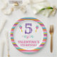 Girls fiesta themed fifth birthday paper plate featuring a colorful striped pattern, large purple number, some maracas and some multicolored text.