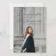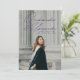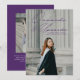 Modern graduation announcement featuring the graduate's vertical photo with "Onwards and Upwards" in a purple handwritten script. Personalize the front of the photo graduation announcement by adding the graduate's name, school, and graduation year. The announcement reverses to display an additional photo with the graduate's future plans, grad party details, etc. shown below.