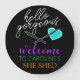 Beautiful contemporary retro wall art clock with bright orange, purple, lime green, aqua turquoise blue, and white coloured Hello Gorgeous, Welcome to My She Shed typography and calligraphy script lettering design on a black background. With the option to customise or personalise with a name or text of your choice. Excellent sign for those who enjoy welcoming friends or family into their woman cave.