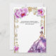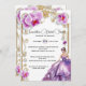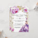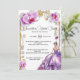 A beautiful faux gold decorative swirl border has delicate purple orchid floral flowers on it and forms a frame around a stark white background. A watercolor lady appears in the bottom right corner wearing an exquisite, luxurious ballgown adorned with small rose flowers. The ball gown has an off the shoulder tight bodice and a ruffle skirt ideal for a bride to be. To her left are luxury black calligraphy script and bold text templates for your custom wording. This invitation is ideal for a summer, spring or fall (autumn) wedding that is being held in a garden or outdoor venue. Celebrate the bride to be with this luxury, trendy and stunning design that is ideal for a bridal shower, Quinceañera or business launching their new wedding and evening dresses to clients.