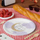Design features faux gold moon with "We are over the moon" in a cute calligraphy text. Personalize with your information or click "Click to customize further" to edit font styles, size and colors.