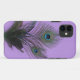 A purple iPhone Case decorated with a colourful bouquet of peacock feathers.