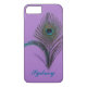 A fancy peacock feather on a purple background decorates this iPhone 7 case. It is easy to personalise with your name or initials.