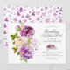 Floral birthday party invitation featuring gorgeous hand painted purple & cream peonies & leafy green leaves. Flip our invite over to view a coordinating purple watercolor butterfly back for an extra special touch.