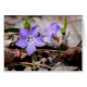 A closeup of a pair of purple Periwinkle (Vinca minor) flowers growing on the forest floor.