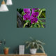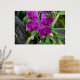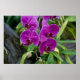 A branch of purple phalaenopsis orchid blooms in a natural setting, glistening with rainwater.
