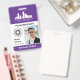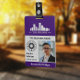 Vertical employee ID with a purple accent colour. Add photo, 2 logos, name, title, ID number and more for a professional looking employee ID badge. A practical and professional employee badge personalised with photo, one larger logo and one smaller logo, along with title, business name, and name.