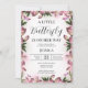 A purple pink floral a little butterfly is on her way baby shower invitation which can be personalised with the inclusion of your baby shower details. The colours are mainly pink with hints of purple in the flowers and butterflies. These invitations could be used for any time of the year but would particularly suit a spring or summer baby shower.