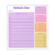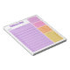 Practical notepad to help you keep track of your daily habits, making sure you drink enough water, stretch at least once every hour during an eight-hour work day, take the number of steps you need, and remember to take your meds or vitamins! There's also a handy to-do list with ten checkboxes so you can make your daily to-do list and check off each task you've finished. At the top, add your name in a bold purple font. The daily habits tracker is printed in colour blocks of pink, purple, orange, and yellow.