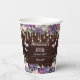 100th birthday party custom paper cups for women with a rustic dark brown barn wood background and twinkling string lights and decorated with pink, lilac, and purple watercolor floral and butterflies. Contact me for assistance with your customisations or to request additional matching or coordinating Zazzle products for your party.
