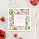 Purple, yellow, and pink watercolor floral and green leaves with gold glitter women's 90th birthday party paper napkins personalised with your name and party date.