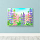 A wrapped canvas print decorated with a garden of pink and purple lupines painted with watercolor accented with green leaves and a warm blue sky. Lovely floral art for your home or office!