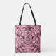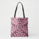 This tote bag features an image of an intricate abstract mandala consisting of small swirling satin fabric folds in luminous shades of wine, purple and pink.
