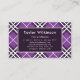 This elegant and modern business card features a purple, black and white plaid background. The text combines modern sans serif fonts for a classy and sophisticated look.