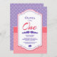 Invite your friends and loved ones with this lavender and pink elephant, polka dots and chevron striped 1st birthday invitation.