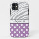 Custom iPhone 5 case personalised with your name, and designed with a purple & white polka dot pattern and a faded zebra print pattern with grey & white zebra stripes.