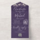 All in one wedding invitation featuring pretty string lights, mason jars, signature style names and chic typography on a purple background. The invitation includes a perforated RSVP card featuring a QR code. Designed by Thisisnotme©