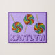 Puzzle design features an original marker illustration of a row of rainbow lollipops on a purple background. Just personalise with your information.