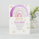 unique first birthday party invitation design. Featuring a rainbow and stars in modern colours.