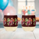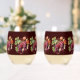 Stemless wine glasses with a deep burgundy background and watercolor red and purple grapes.