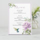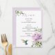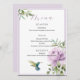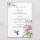 It is a simple and lovely image featuring a watercolor purple rose, leaves, and a vibrant hummingbird against a white background with a soft purple border.