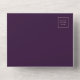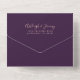 The left-hand edge of this elegant modern all-in-one wedding invitation and RSVP features a rose gold faux glitter border. The customizable text combines rose pink whimsical handwriting, copperplate and italic fonts on a purple background. The return address appears on the outside flap and the reverse side of the detachable RSVP card in rose pink text on solid purple. A QR code is included on the RSVP card for guests who would prefer to reply online.