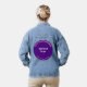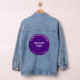Women's denim jacket with your business name, logo, city or town and state. Jacket that you can include in your promotional products, giveaway items or gifts to your customers or clients to advertise your business or to promote your brand name. Jacket with your business brand that you can use to build brand name awareness. Jacket as uniform also of your staff. Design colours are pink texts on purple round shape background. Please check the appearance after uploading logo and typing texts on the size that you chose. If the appearance is pleasing to you, you can place your order now. If you need to resize and move the logo and texts, please change in the design tool. You can also change the font style, font colour and colour of the round shape background in the design tool.