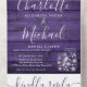 All in one wedding invitation featuring pretty string lights, mason jars, signature style names and chic typography on a purple rustic wood background. The invitation includes a perforated RSVP card featuring a QR code. Designed by Thisisnotme©