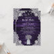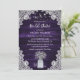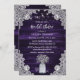 Custom rustic purple bridal shower invitations featuring a baby's breath bouquet inside a mason jar on a barn wood background adorned with white floral lace and string lights. Easily personalise this beautiful purple rustic floral bridal shower invitation with your event details.