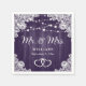 Decorate your purple rustic wedding party with these romantic Mr. and Mrs. wedding paper napkins featuring intertwined hearts against a rustic wood background adorned with elegant floral lace and string lights.