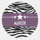Trendy and modern Sassy Star Zebra Stickers featuring a chic black and white zebra print background and a bold purple border adorned with a fun star motif. This girly design may be customised with the personalised text of your choosing. Click "Customise It" to find more personalisation options.