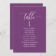Help your guests find their table with this elegant modern seating plan cards with guests names. Double sided cards so guests can look from both, front or back for their names. Clear space all around giving you the liberty to use clips or punch hole for hanging displays, or use table holder/frame. Purple tone background and white text. Modern hand written calligraphy details. Several colour options. Have all table numbers in same colour or mix colours according to your event's colour theme.