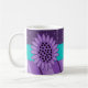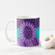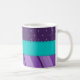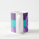 Modern coffee mug with a purple flower, turquoise eyelet ribbon on a purple polka dot and strip background. Customise it by adding text if you wish.