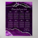 Guide your guests in style with this elegant wedding seating chart featuring a purple agate marble design accented with luxurious silver details. The bold geode-inspired background creates a dramatic and sophisticated look, perfect for fall and winter weddings, formal celebrations, or glamourous evening events. Designed for up to eight tables, the layout keeps names organised and easy to read while complementing the organic agate texture. Ideal for couples seeking a stylish and unique wedding display, this seating chart blends natural stone aesthetics with a refined, modern layout. Easily personalise all text to match your wedding details and create a beautiful focal point for your reception.