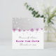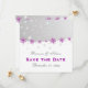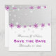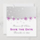 Purple silver grey white snowflake wedding Save the Date announcement, featuring a waved band in silver grey with stars and purple elegant snowflakes. Text in grey and purple. A stylish design perfect for your winter, December or Christmas wedding. Modern and contemporary yet suitable for a traditional wedding. This elegant, classy design can be used for other special occasions such as engagements or anniversaries.