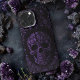 Purple Skull iPhone 13 Pro Max Case. © Dark Heart Desires. This gothic iPhone 13 Pro Max case is black with a purple floral and skull design on it.