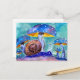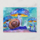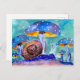 traditional watercolor artwork of surreal blue mushrooms and purple coloured snail with a spiral shell on a postcard.